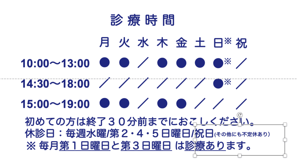 2012年以来、日曜日の診療を続けていて「日曜日やっているから通院できる、ありがとう。」とのお声も多く、私自身も患者さんの立場だったらそう思うだろうな、というところもあり、縮小はしてきましたが、現在、毎月「第一日曜、第三日曜は診療します」と掲げるように変遷してきました。
